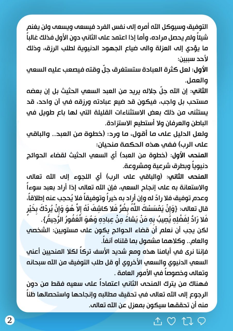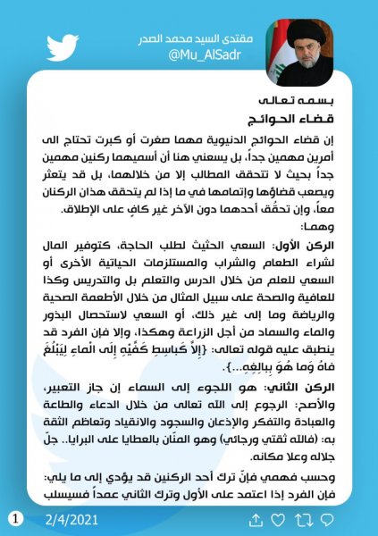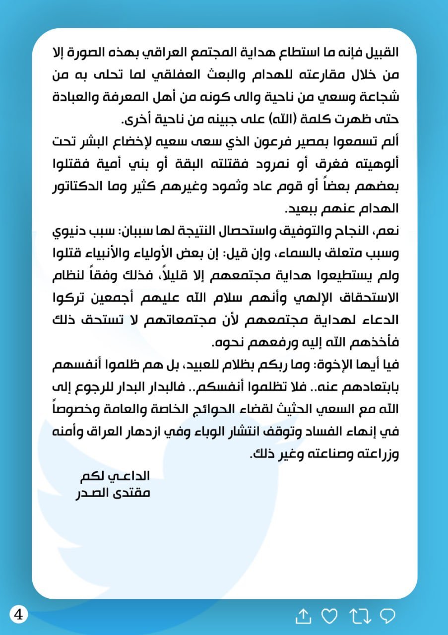 وقال الصدر في تغريدة على تويتر، "يا أيها الاخوة: وما ربكم بظلام للعبيد.. بل هم ظلموا انفسهم بابتعادهم عنه.. فلا تظلموا انفسكم.. فالبدار البدار الى الرجوع الى الله مع السعي الحثيث لقضاء الحوائج الخاصة والعامة وخصاصاً انهاء الفساد وتوقف انتشار الوباء وازدهار العراق وأمنه وزراعته وصناعته وغير ذلك".