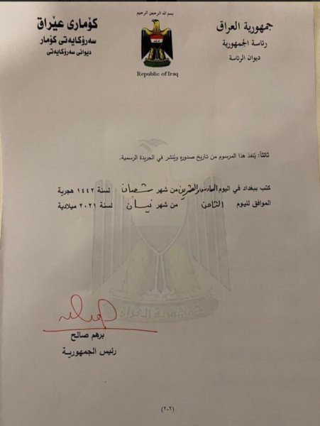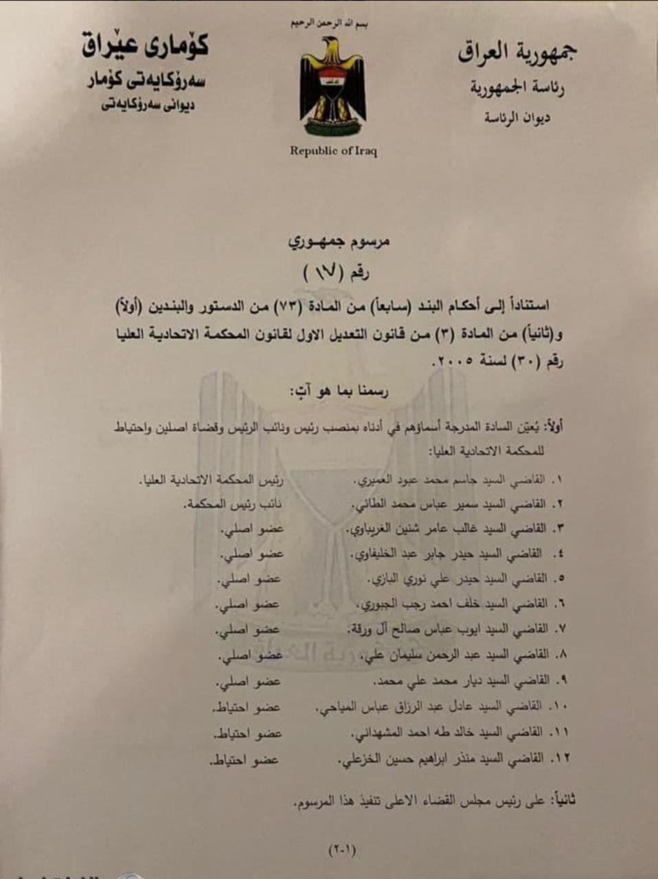 أصدر رئيس الجمهورية برهم صالح مرسوما يقضي بتعيين اعضاء المحكمة الاتحادية