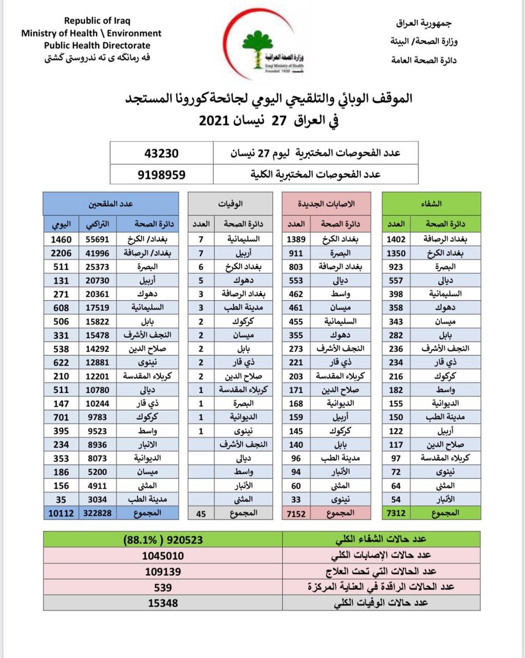 وقالت الوزارة في بيان حصلت تنوع نيوز على نسخة منه، إنها "سجلت 7152 إصابة جديدة، مقابل تماثل 7312 حالة شفاء، و 45 وفاة بالفيروس".