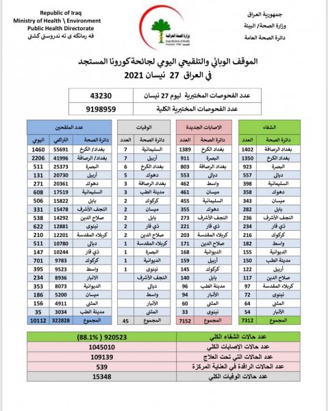 أعلنت وزارة الصحة، اليوم الثلاثاء، الموقف الوبائي الخاص بجائحة كورونا في عموم العراق.