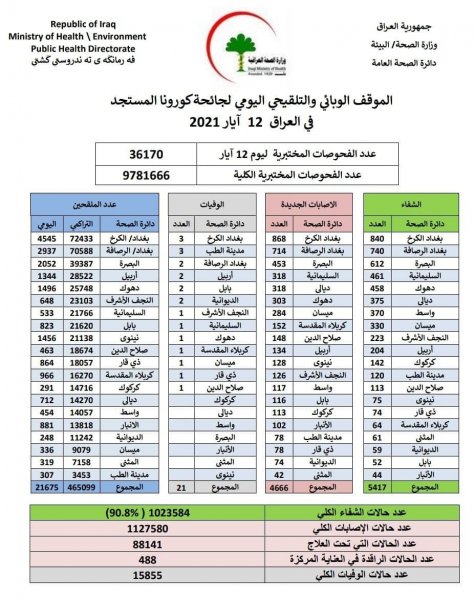 أعلنت وزارة الصحة، اليوم الأربعاء، الموقف الوبائي الخاص بجائحة كورونا في عموم العراق.