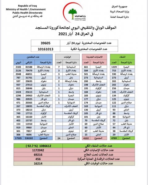 وقالت الوزارة في بيان حصلت تنوع نيوز على نسخة منه، إنها "سجلت 4102 حالة إصابة جديدة، مقابل تماثل 4769 حالة للشفاء، و 24 حالة وفاة بفيروس كورونا".