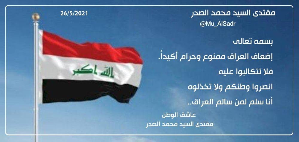 وقال الصدر في تغريدة له على "تويتر"، إن "اضعاف العراق ممنوع وحرام اكيدا فلا تتكالبوا عليه انصروا وطنكم ولا تخذلوه".