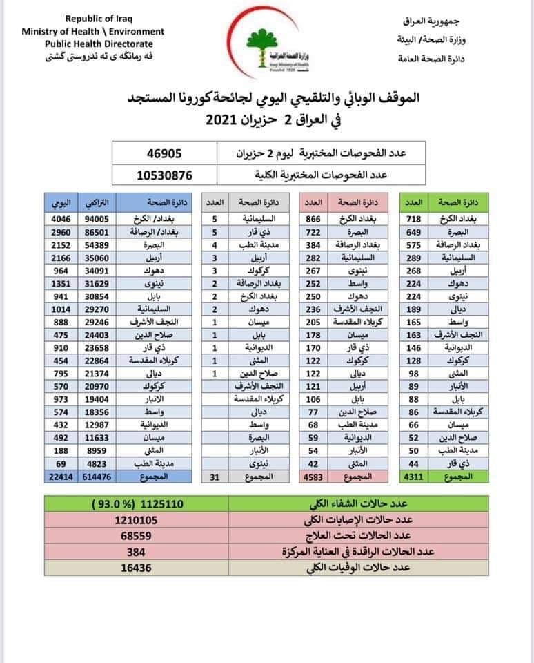أعلنت وزارة الصحة، اليوم الأربعاء، الموقف الوبائي الخاص بجائحة كورونا في عموم العراق.