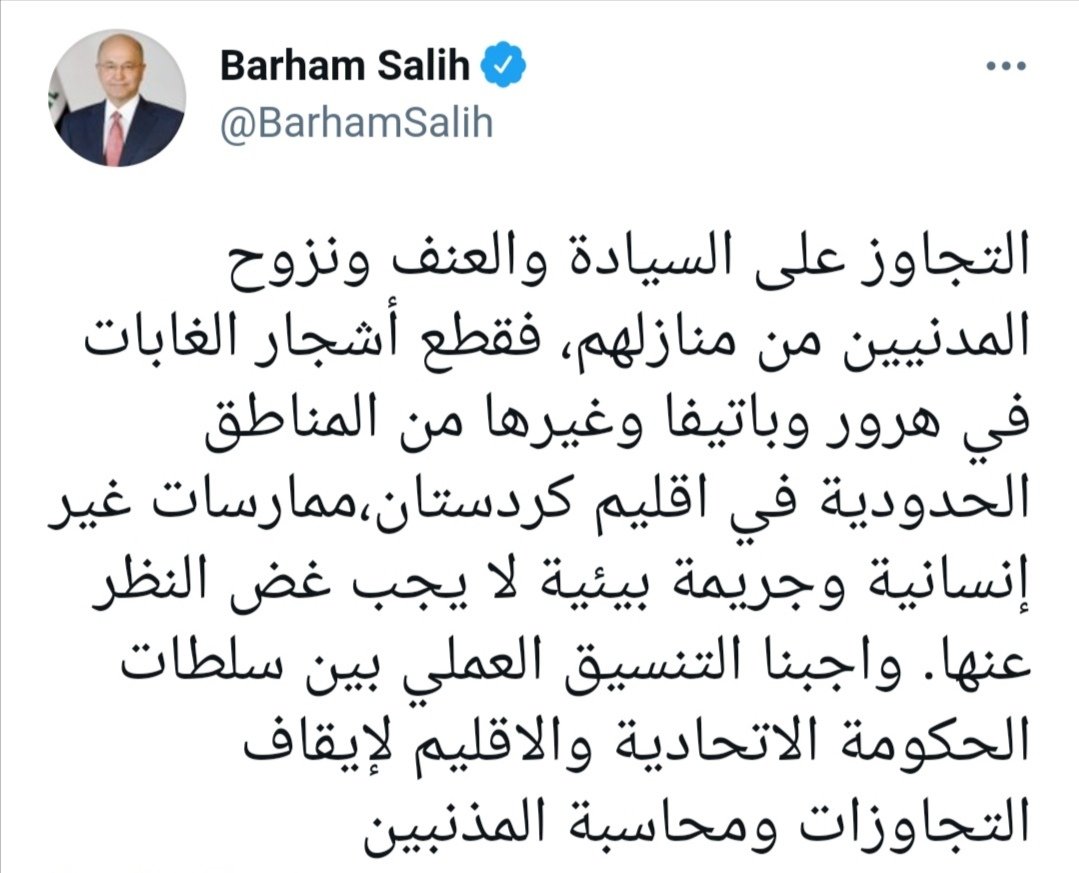 وقال رئيس الجمهورية في تغريدة على حسابه الشخصي بموقع تويتر وتابعته وكالة تنوع نيوز إنه "بالإضافة إلى كسر السيادة والحرب والنازحين، فإن قطع الغابات الطبيعية في هورور وباتوفة والمناطق الحدودية في كردستان جريمة ضد البشر والبيئة، وليس سببا للمغفرة".