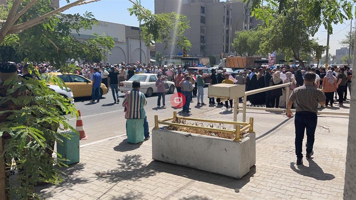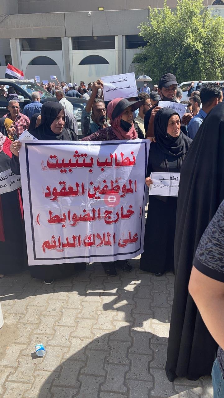 تظاهر العشرات من موظفي العقود في وزارة الثقافة، اليوم الاحد، بالقرب من مقرها في العاصمة بغداد.