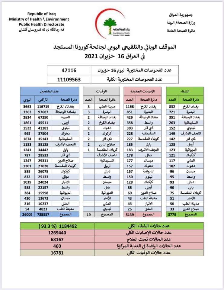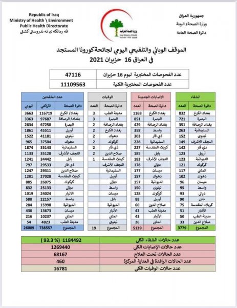 وأضاف البيان، أن "حالات الوفاة الجديدة بكورونا بلغت 19 حالة في عموم محافظات البلاد"، لافتا إلى أن "الاشخاص الذين تلقوا اللقاح خلال 24 ساعة بلغ عددهم 26009".