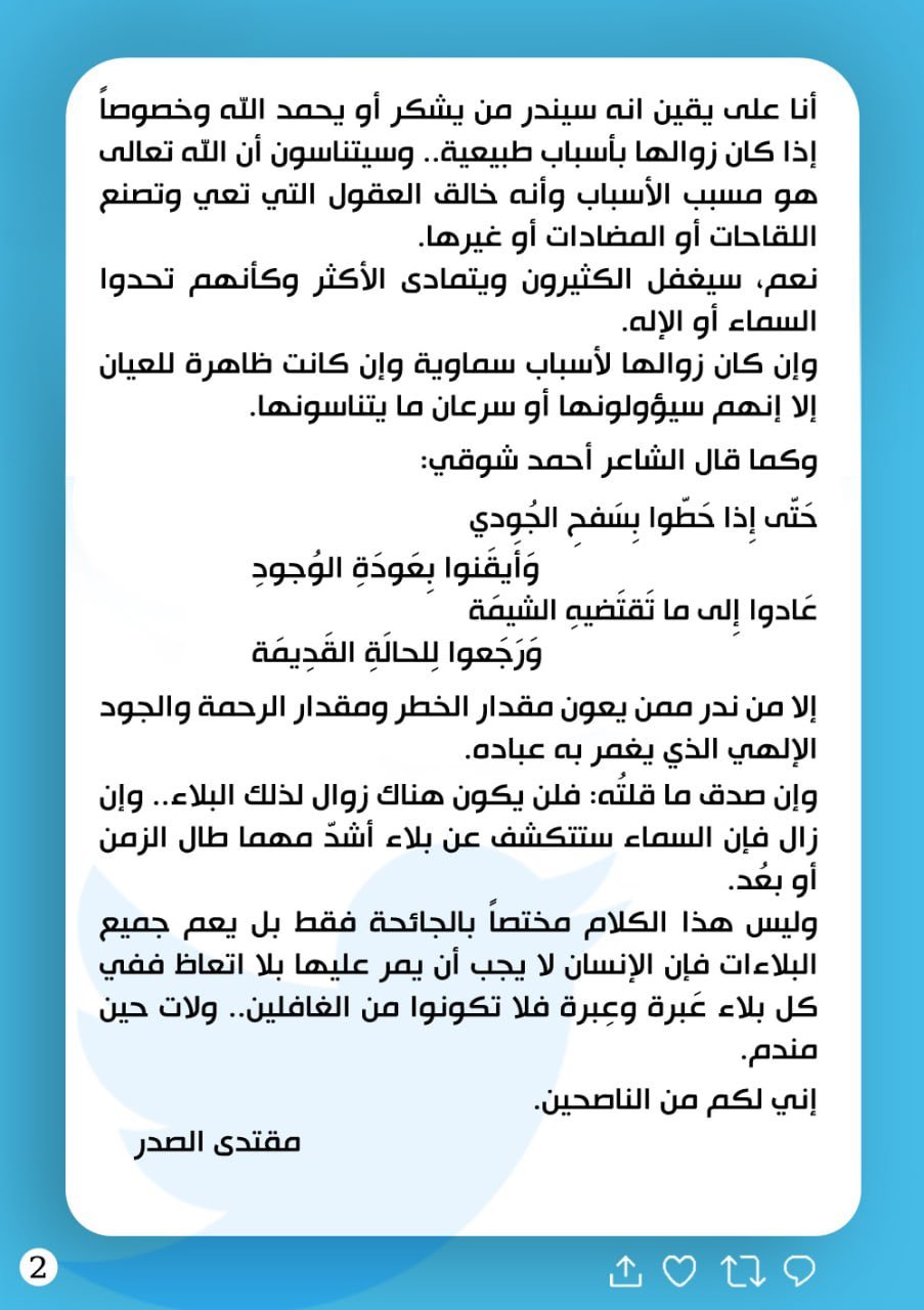 قال السيد مقتدى الصدر في تغريدة له على تويتر، إن "البشر إجمالاً لم يتعظوا من جائحة كورونا"،واضاف أن السماء ستكشف عن بلاء أشد من الجائحة الحالية بسبب "الاثام". ادناه نص التغريدة: