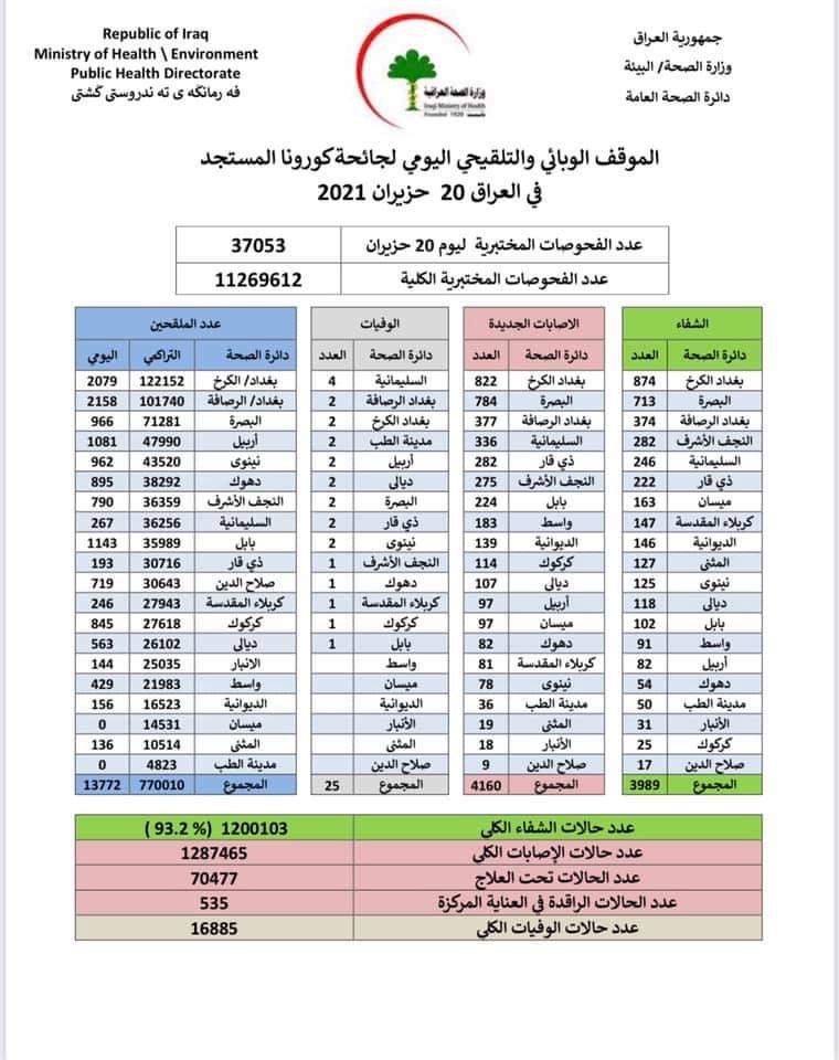 وذكرت الوزارة، في بيان، أنها "سجلت 4160 إصابة جديدة بفيروس كورونا، وتماثل 3989 شخصا للشفاء". وأضاف البيان، أن "حالات الوفاة الجديدة بكورونا بلغت 25 حالة في عموم محافظات البلاد"، لافتا إلى أن "الاشخاص الذين تلقوا اللقاح خلال 24 ساعة بلغ عددهم 13772".