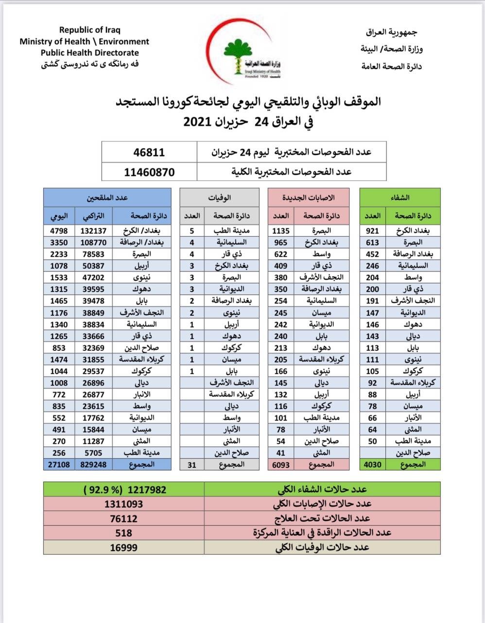 وذكرت الوزارة، في بيان ، أنها "سجلت 6093 إصابة جديدة بفيروس كورونا، وتماثل 4030 شخصا للشفاء". وأضاف البيان، أن "حالات الوفاة الجديدة بكورونا بلغت 31 حالة في عموم محافظات البلاد"، لافتا إلى أن "الاشخاص الذين تلقوا اللقاح خلال 24 ساعة بلغ عددهم 27108".