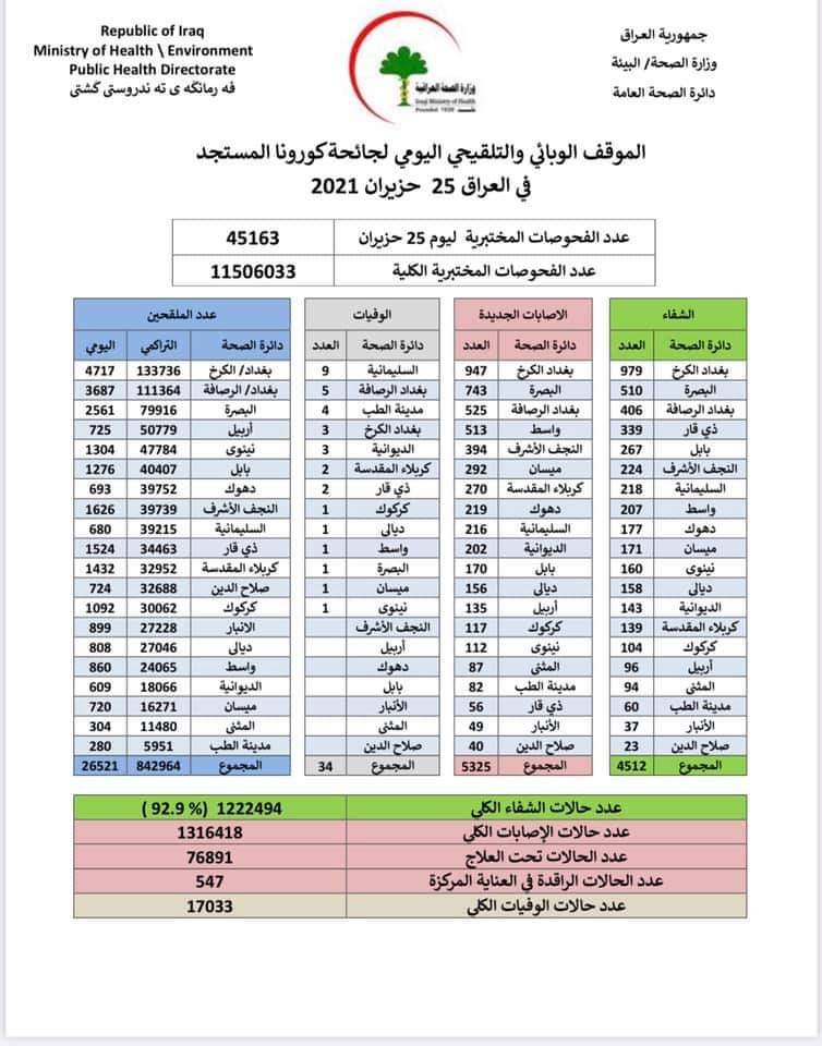 وذكرت الوزارة، في بيان ، أنها "سجلت 5325 إصابة جديدة بفيروس كورونا، وتماثل 4512 شخصا للشفاء". وأضاف البيان، أن "حالات الوفاة الجديدة بكورونا بلغت 34 حالة في عموم محافظات البلاد"، لافتا إلى أن "الاشخاص الذين تلقوا اللقاح خلال 24 ساعة بلغ عددهم 26521".