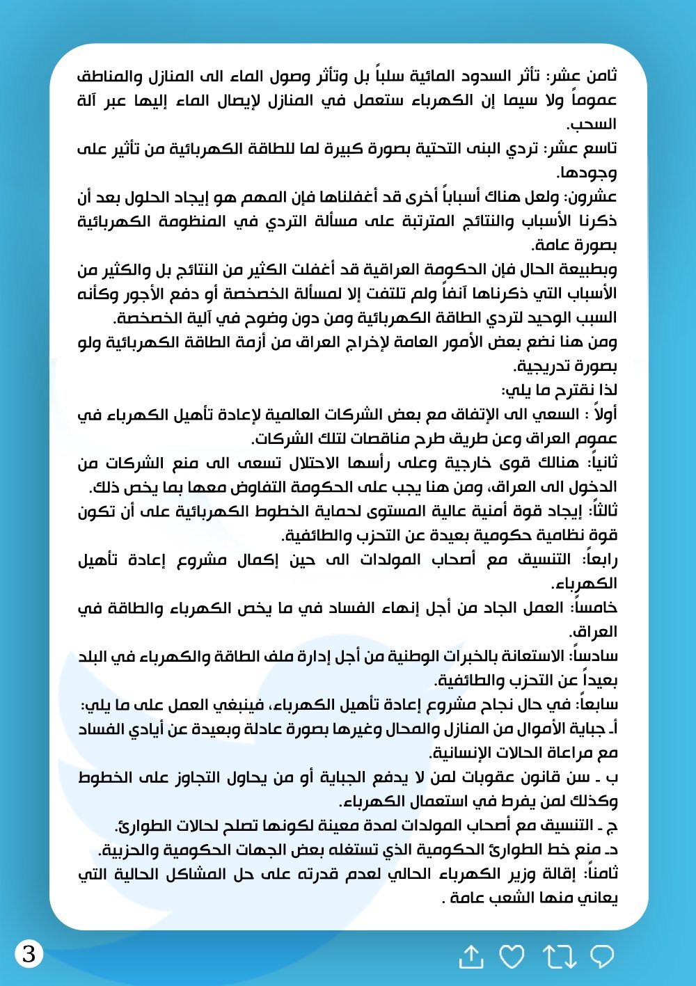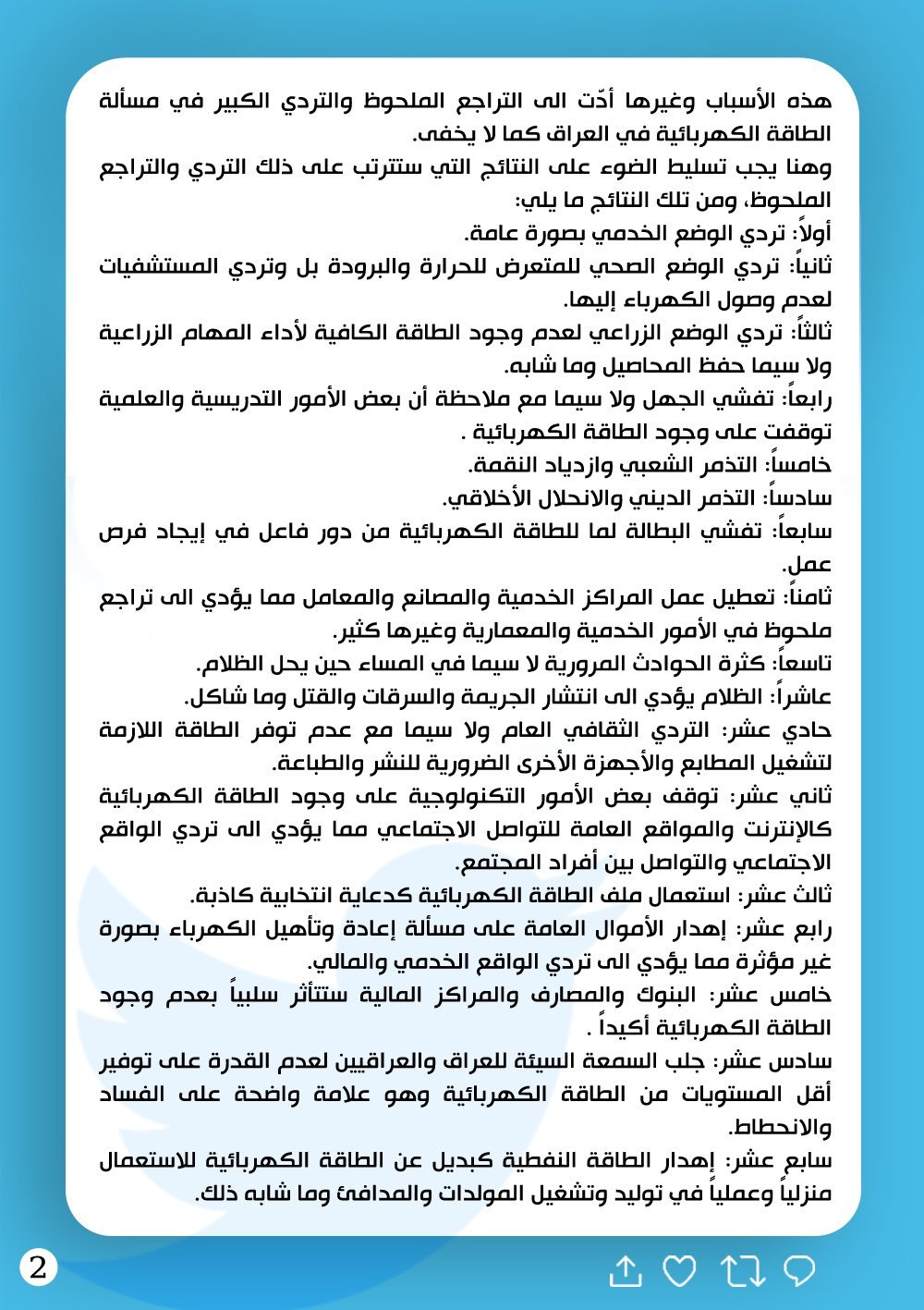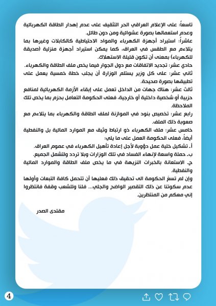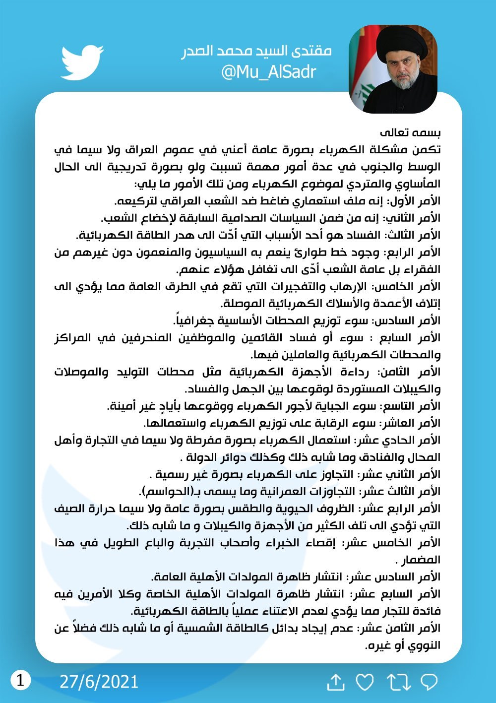 حدد زعيم التيار الصدري، السيد مقتدى الصدر، اليوم الأحد، اسباباً تقف وراء أزمة الكهرباء في العراق.