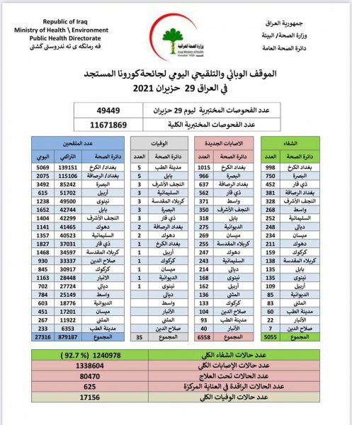 وأضاف البيان، أن "حالات الوفاة الجديدة بكورونا بلغت 35 حالة في عموم محافظات البلاد"، لافتا إلى أن "عدد الاشخاص الذين تلقوا اللقاح في 24 ساعة الماضية بلغ 27316".