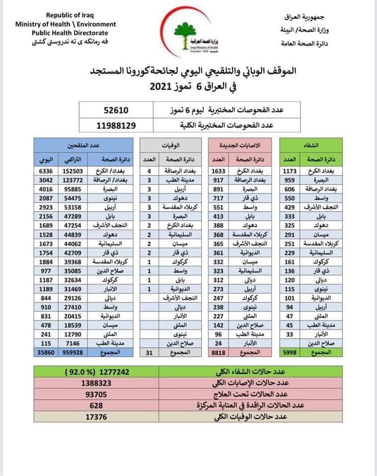 وذكرت الوزارة، في بيان، أنها "سجلت 8818 إصابة جديدة بفيروس كورونا، وتماثل 5998 شخصا للشفاء". وأضاف البيان، أن "حالات الوفاة الجديدة بكورونا بلغت 31 حالة في عموم محافظات البلاد"، لافتا إلى أن "عدد الاشخاص الذين تلقوا اللقاح في 24 ساعة الماضية بلغ 35860"