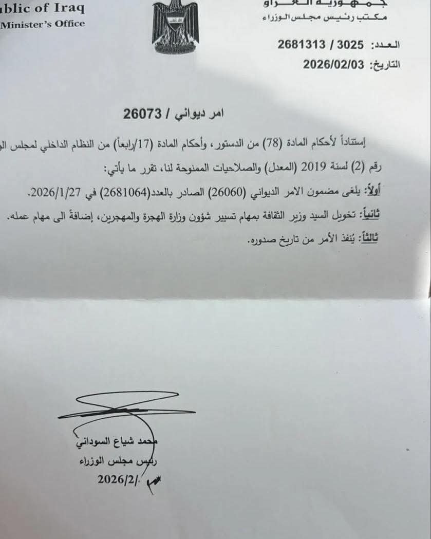 "أصدرت الأمانة العامة لمجلس الوزراء، اليوم السبت، توجيهاً يقضي بإحالة مدير صحة محافظة ديالى علي حسين حسن الى التقاعد. وحصلت تنوع نيوز على وثيقة معنونة الى مكتب الوزير في وزارة الصحة وتحمل توقيع الأمين العام لمجلس الوزراء حميد نعيم الغزي، جاء فيها: "الموضوع/ إحالة علي حسين حسن المدير العام لدائرة صحة ديالى الى التقاعد وفقاً لقرار مجلس الوزراء رقم 239 لسنة 2021 المأخوذ في الجلسة الاعتيادية السابعة والعشرين المنعقدة في 13/7/2021