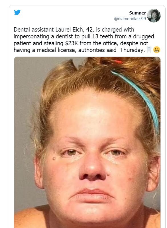 ووقع هذا الحادث الغريب والمؤلم في مقاطعة واشو في ولاية نيفادا الأمريكية، حيث قامت لوريل إيتش البالغة من العمر 42 عاما أيضا بسرقة نحو 23 ألف دولار أمريكي من مكتب عيادة الأسنان الذي تعمل به كمساعدة الطبيب، وفقا لما نقلته صحيفة "ديلي ميل" البريطانية.