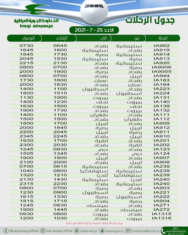 أعلنت الخطوط الجوية العراقية، اليوم السبت،مواعيد رحلاتها ليوم غد الأحد.وبحسب الجدول أدناه فإن عدد الرحلات بلغ 41 رحلة، توزعت بين داخلية وخارجية، إذ بلغ عدد الرحلات الداخلية 18 رحلة، والخارجية 23 رحلة.