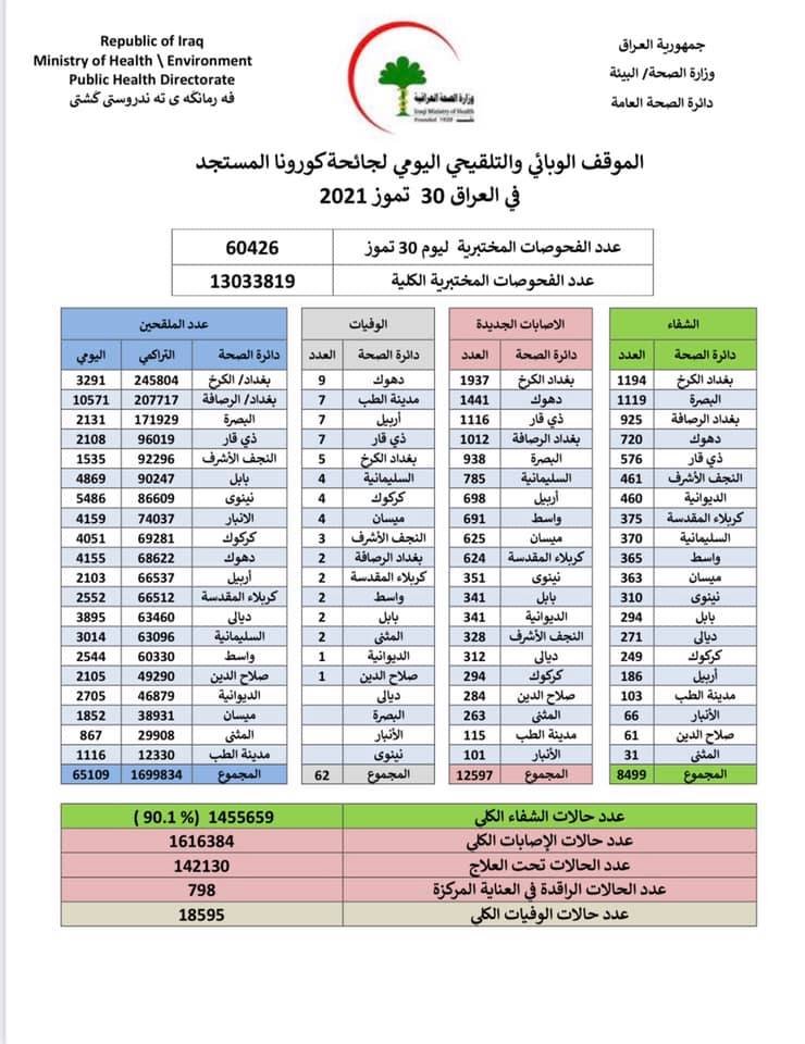وأضاف البيان أن "حالات الوفاة الجديدة بكورونا بلغت 62 حالة في عموم محافظات البلاد"، لافتا إلى أن "الاشخاص الذين تلقوا اللقاح خلال 24 ساعة بلغ عددهم 65109".