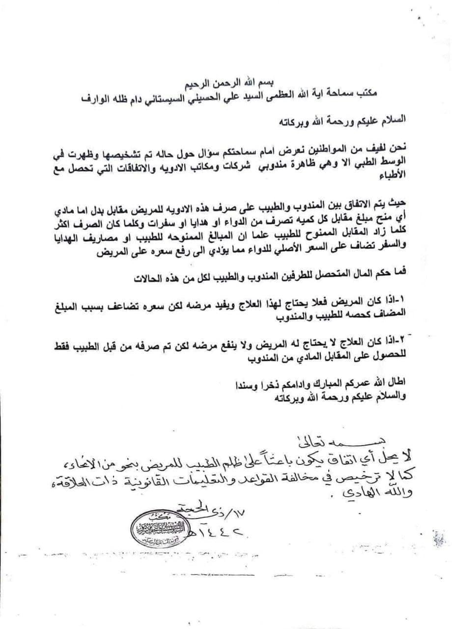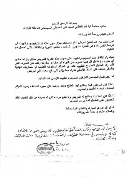 حصلت وكالة تنوع نيوز على استفتاء جديد للمرجع الأعلى السيد علي السيستاني بشأن "أسعار الأدوية" ومخالفة القواعد والتعليمات القانونية