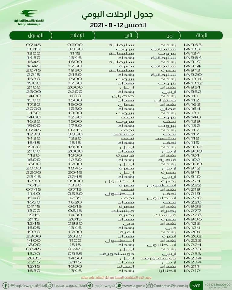 أعلنت الخطوط الجوية العراقية، اليوم الأربعاء، عن رحلاتها ليوم غد الخميس.وبحسب الجدول أدناه فان عدد الرحلات بلغ 54 رحلة، توزعت بين 22 رحلة داخلية و32 رحلة أخرى خارجية.