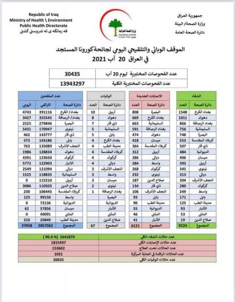 وأضاف البيان، أن "حالات الوفاة الجديدة بكورونا بلغت 67 حالة في عموم محافظات البلاد"، لافتا إلى أن "الاشخاص الذين تلقوا اللقاح خلال 24 ساعة بلغ عددهم 37858".