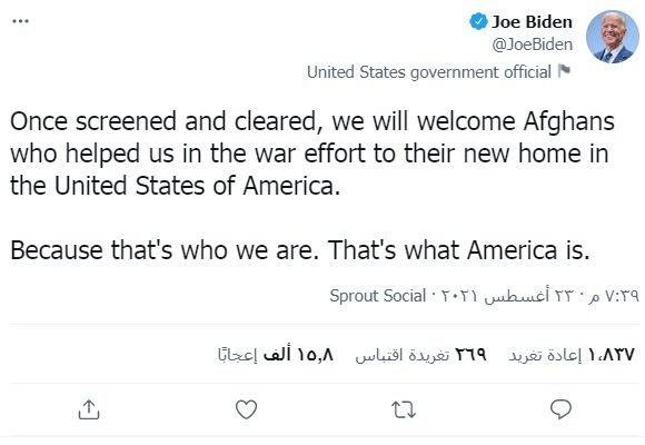 وقال بايدن في تغريدة تابعتها وكالة تنوع نيوز ، سنرحب بالأفغان الذين ساعدونا في المجهود الحربي في وطنهم الجديد الولايات المتحدة الأمريكية. لأن هذا ما نحن عليه. هذه هي أمريكا.