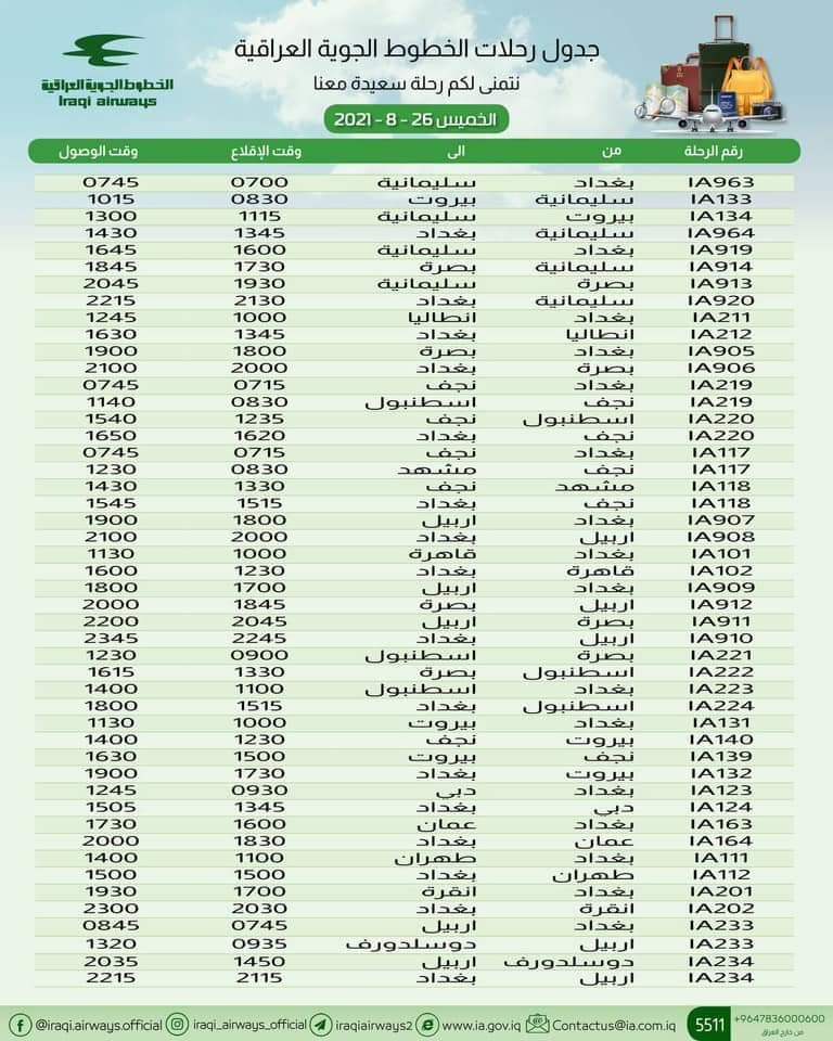 أعلنت الخطوط الجوية العراقية، اليوم الاربعاء،عن موعد رحلاتها ليوم غد الخميس.وبحسب الجدول أدناه فإن عدد الرحلات بلغ 48 رحلة، توزعت بين داخلية وخارجية، إذ بلغ عدد الرحلات الداخلية 20 رحلة، والخارجية 28 رحلة.