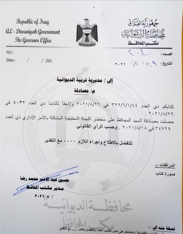 أعلنت محافظة الديوانية، اليوم الاحد، عن بشرى سارة للمتعاقدين في تربية المحافظة.