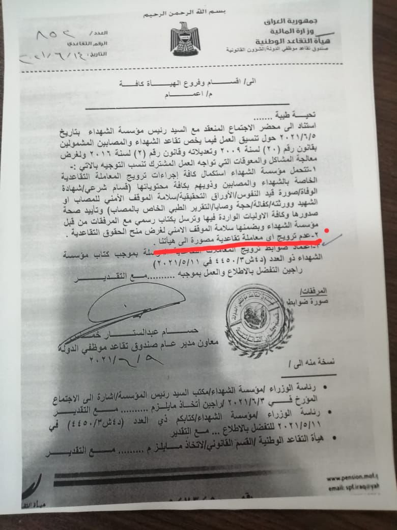 ثالثا: ان تعليمات ان المقر العام لهئية التقاعد الوطنية ابلغت مؤسسة الشهداء بعدم استلام اي معاملة لا تخضع للشروط القانونية والتعليمات والضوابط، حيث ان اغلب المعاملات المرفوعة سابقا هي معاملات مصورة (مستنسخة) ولا توجد فيها سلامة موقف امني صريح وراي المدعي العام الذي نص عليه القانون .