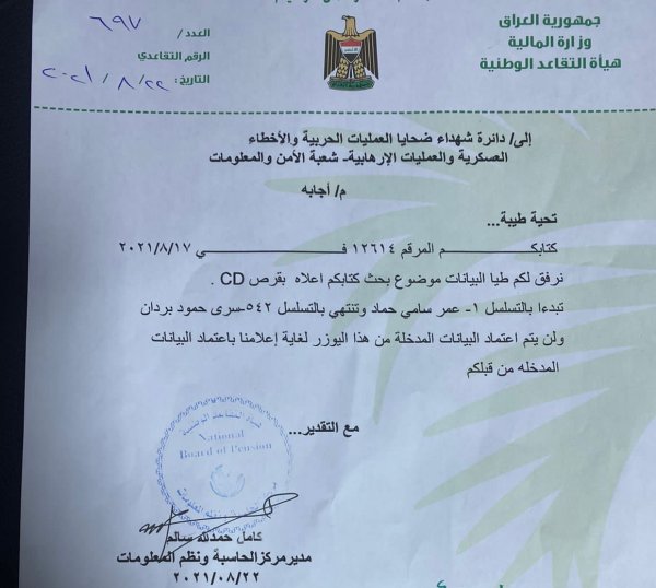 وبعد انطلاقها لوحظ ادخال معاملات عبر يوزراتكم جديدة من مكان تم تحديده من قبل استخبارات وزارة الداخلية والاجهزة الامنية واعلام هيئة التقاعد الوطنية بذلك