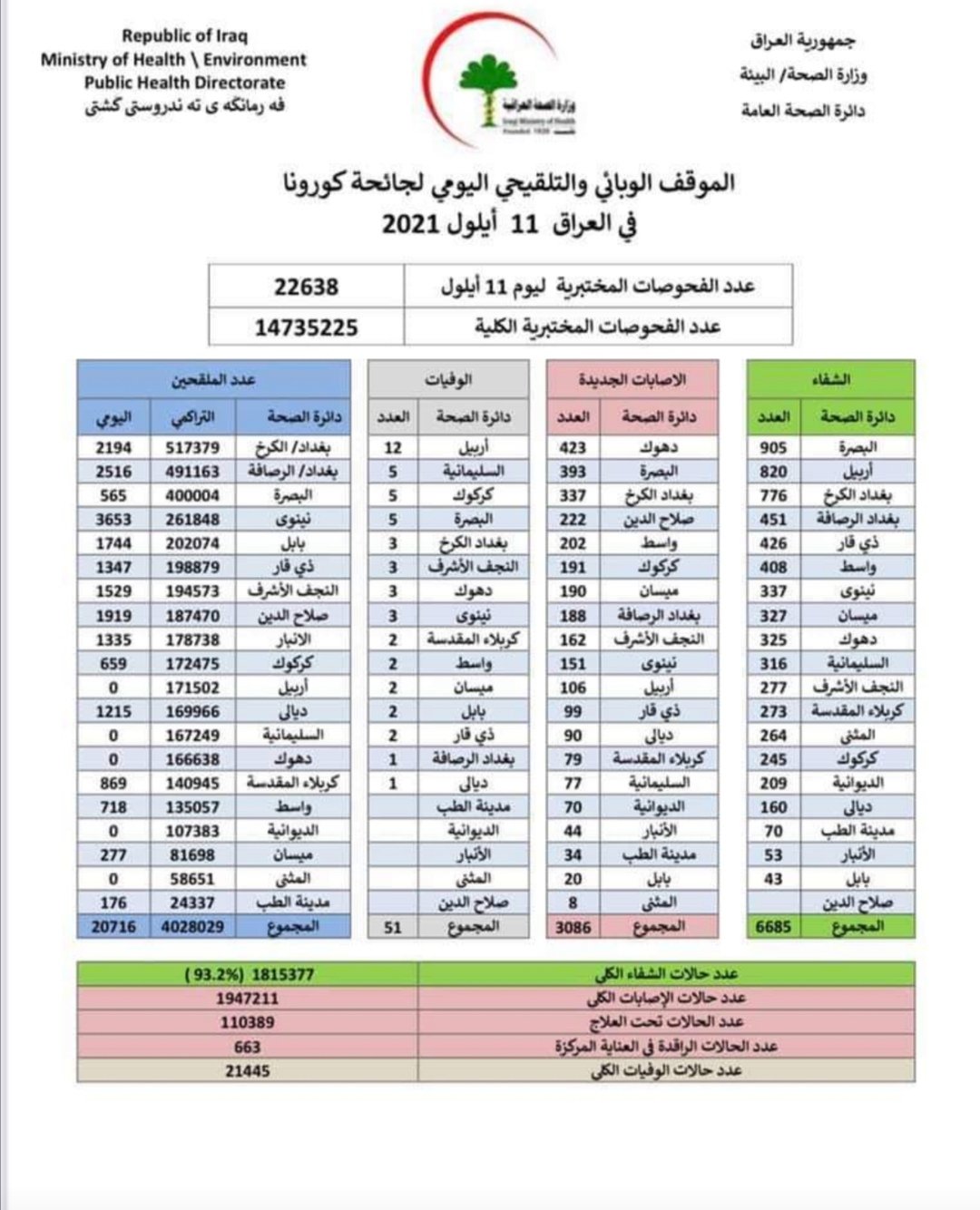 وأضاف البيان، أن "حالات الوفاة الجديدة بكورونا بلغت 51 حالة في عموم محافظات البلاد"، لافتا إلى أن "الاشخاص الذين تلقوا اللقاح خلال 24 ساعة بلغ عددهم 20716".وسجل العراق أمس، 4717 إصابة بكورونا قابلتها 61 حالة وفاة.