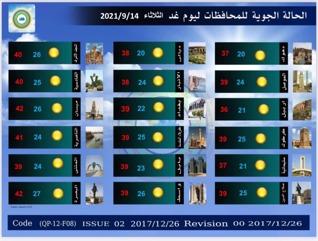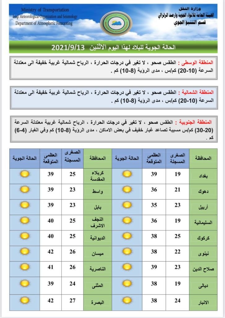 ونشرت الأنواء الجوية جداول توضح درجات الحرارة في المحافظات العراقية.
