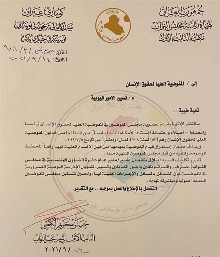 صدوت عن مجلس النواب وثيقة تحمل توقيع النائب الأول لرئيس البرلمان حسن كريم الكعبي، تتضمنت قرار هاماً يخص موظفي مفوضية حقوق الانسان
