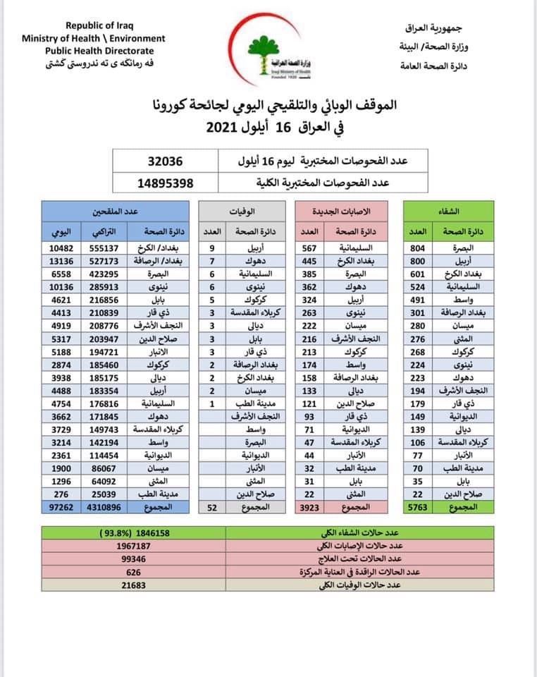 وأضاف البيان، أن "حالات الوفاة الجديدة بكورونا بلغت 52 حالة في عموم محافظات البلاد"، لافتا إلى أن "الاشخاص الذين تلقوا اللقاح خلال 24 ساعة بلغ عددهم 97262".