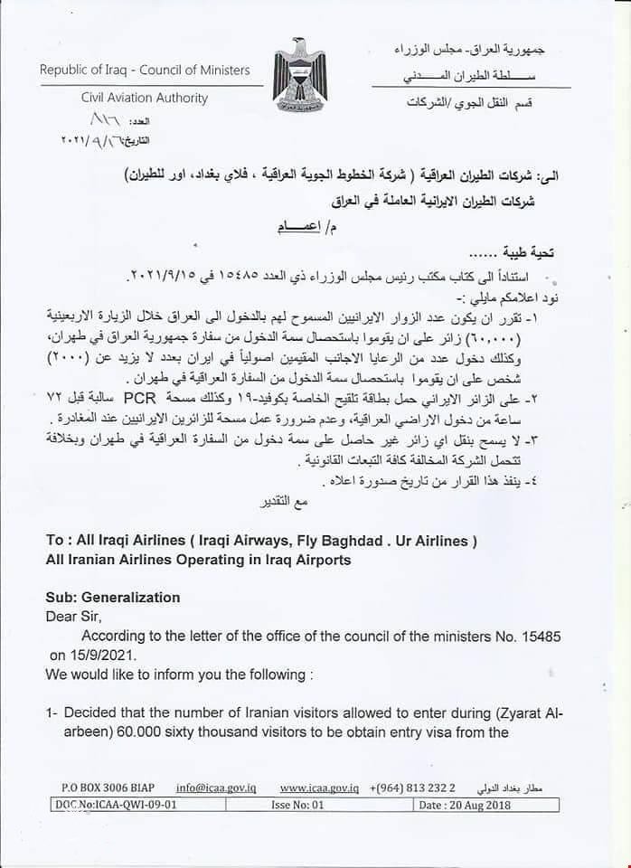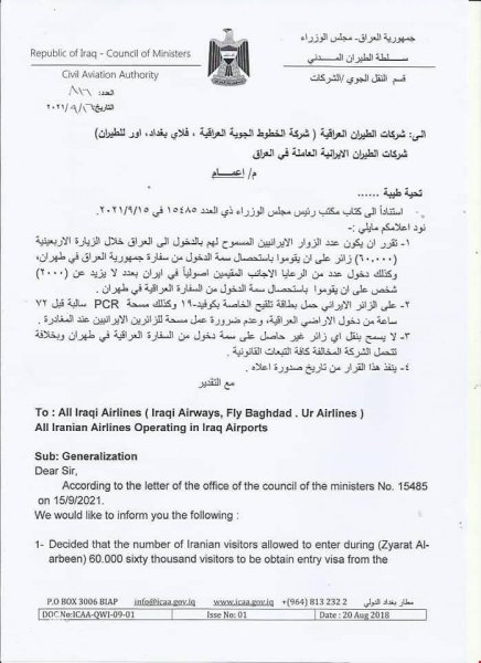 فرضت سلطة الطيران شروطا لدخول الزائرين الإيرانيين إلى العراق