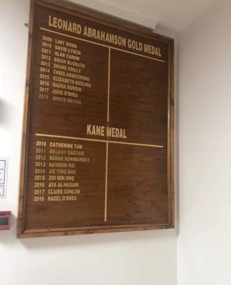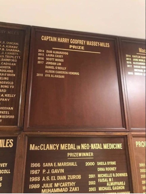 وتم كتابة اسمها على أربعة لوحات في جدران ممرات الكلية كي يبقى هناك دائما.