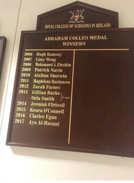 حصلت الطالبة العراقية آية سنان عبد الامير الحسني، الاثنين، على مرتبة الشرف الدرجة الاولى على جميع العرب والعراقيين من الكلية الملكية للجراحين في ايرلندا.وتمكنت الحسني من الحصول على مرتبة الشرف من الدرجة الاولى وبتكريم خاص من الكلية الملكية  اثناء حفل التخرج وكانت هي الطالبة الوحيدة من العرب تحصل على تكريم وجائزة في حفل التخرج الذي أقيم في (٤ حزيران ٢٠١٩)، كما حصلت اثناء مسيرتها الدراسية على ١٤ شهادة تكريم وجائزة وميدالية، بالاضافة الى ترشيحها ل ٢١ جائزة اخرى.