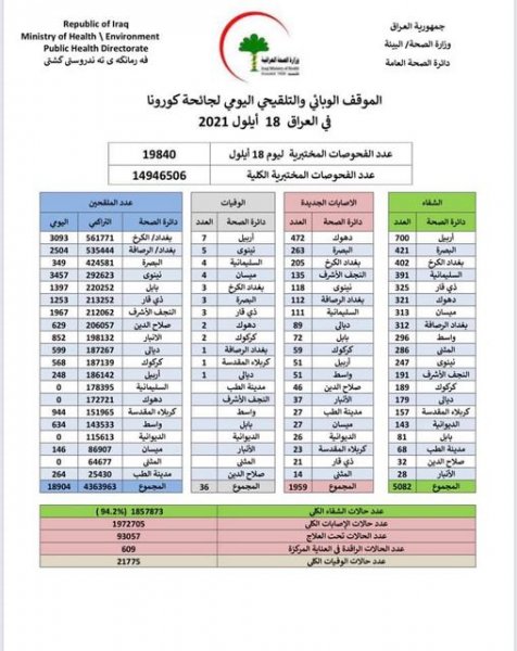وأضاف البيان، أن "حالات الوفاة الجديدة بكورونا بلغت 36 حالة في عموم محافظات البلاد"، لافتا إلى أن "عدد الذين تلقوا اللقاح خلال الساعات الـ24 الأخيرة بلغ 18904".