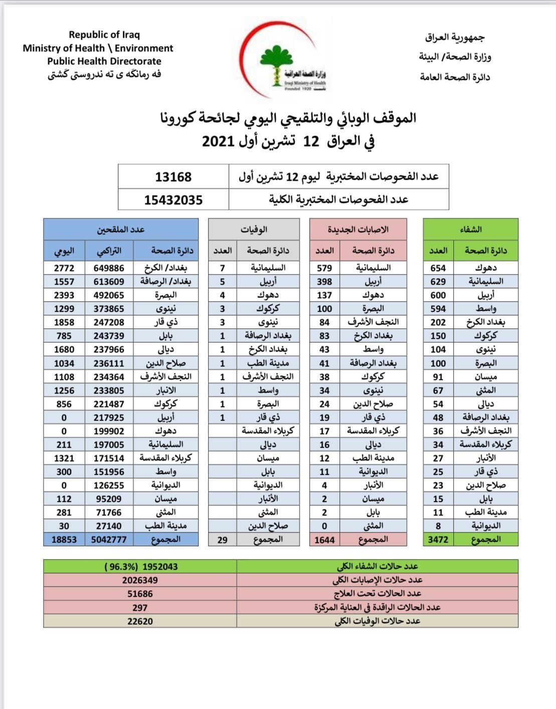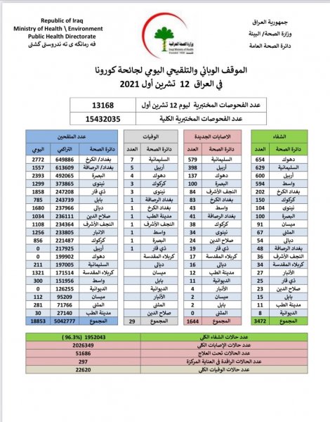 أعلنت وزارة الصحة والبيئة، اليوم الثلاثاء، الموقف الوبائي اليومي لجائحة كورونا في عموم البلاد.وذكرت الوزارة، في بيان ، أنها "سجلت 1644 إصابة جديدة بفيروس كورونا، وتماثل 3472 شخصا للشفاء".وأضاف البيان، أن "حالات الوفاة الجديدة بكورونا بلغت 29 حالة في عموم محافظات البلاد"، لافتا إلى أن "الاشخاص الذين تلقوا اللقاح خلال 24 ساعة بلغ عددهم 18853".