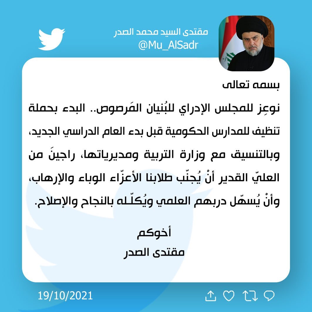 أصدر زعيم التيار الصدري السيد مقتدى الصدر، اليوم الثلاثاء، توجيها للمجلس الإداري للبنيان المرصوص. وقال الصدر في تغريدة له "نوعز للمجلس الإداري للبنيان المرصوص البدء بحملة تنظيف المدارس الحكومية قبل بدء العام الدراسي الجديد". أدناه نص التغريدة :
