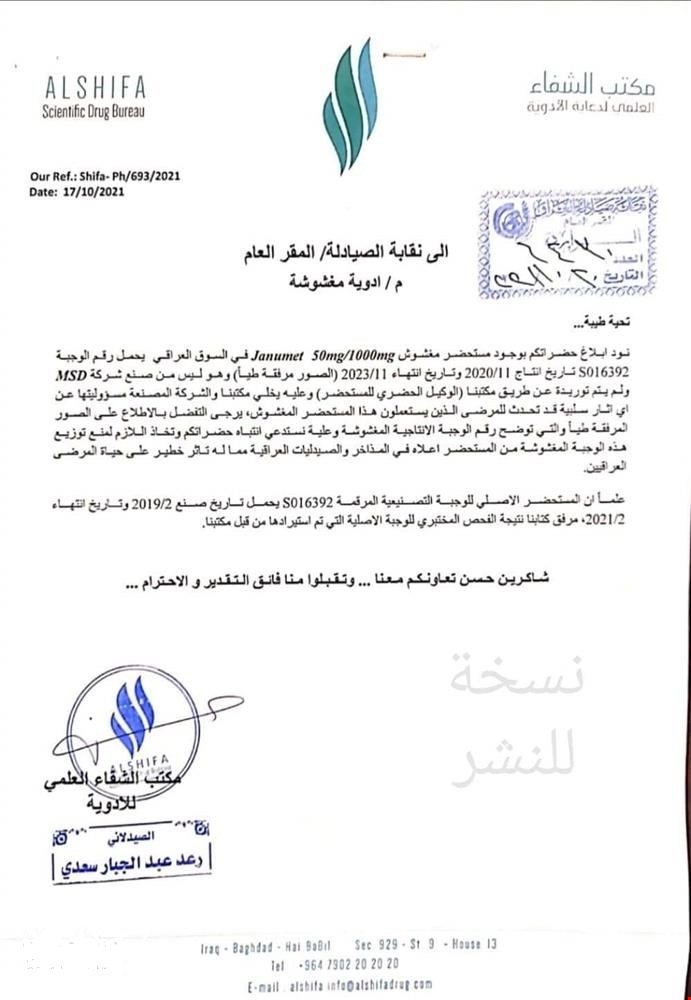 أصدرت نقابة صيادلة العراق، اليوم الاثنين، تنويها عن دواء مغشوش في السوق العراقي.