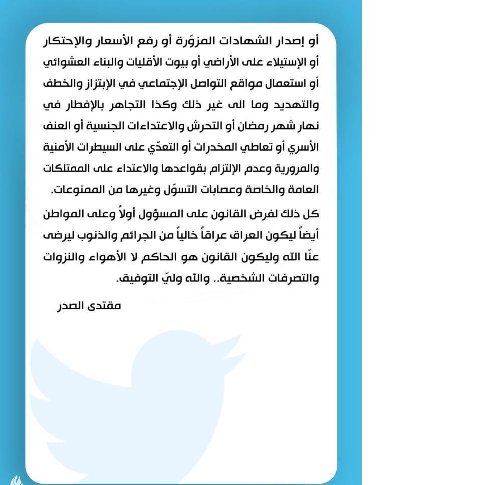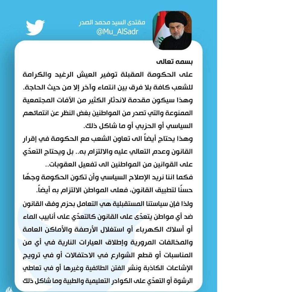 السيد الصدر: سياستنا المستقبلية التعامل بحزم وفق القانون
