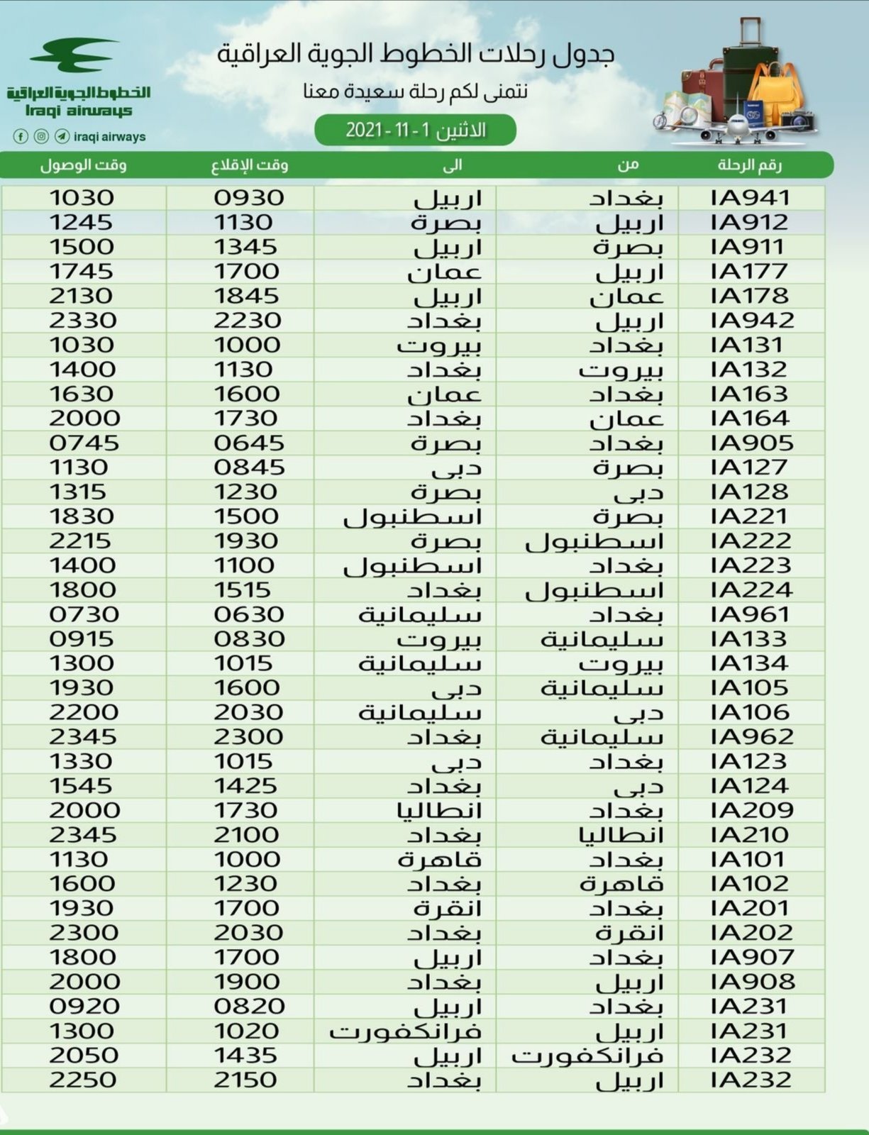 جدول رحلات الخطوط الجوية العراقية غدا