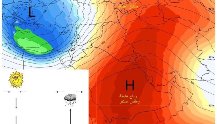 وتابع أن “الوضع الحالي يشير الى سيطرة مرتفع جوي على وسط الجزيرة العربية وجنوب العراق وصل تأثيره لمناطق الوسط ايضا نتيجة لضعف التبريد القادم من اوروبا فهو غير قادر على زحزحة المرتفع القوي”.