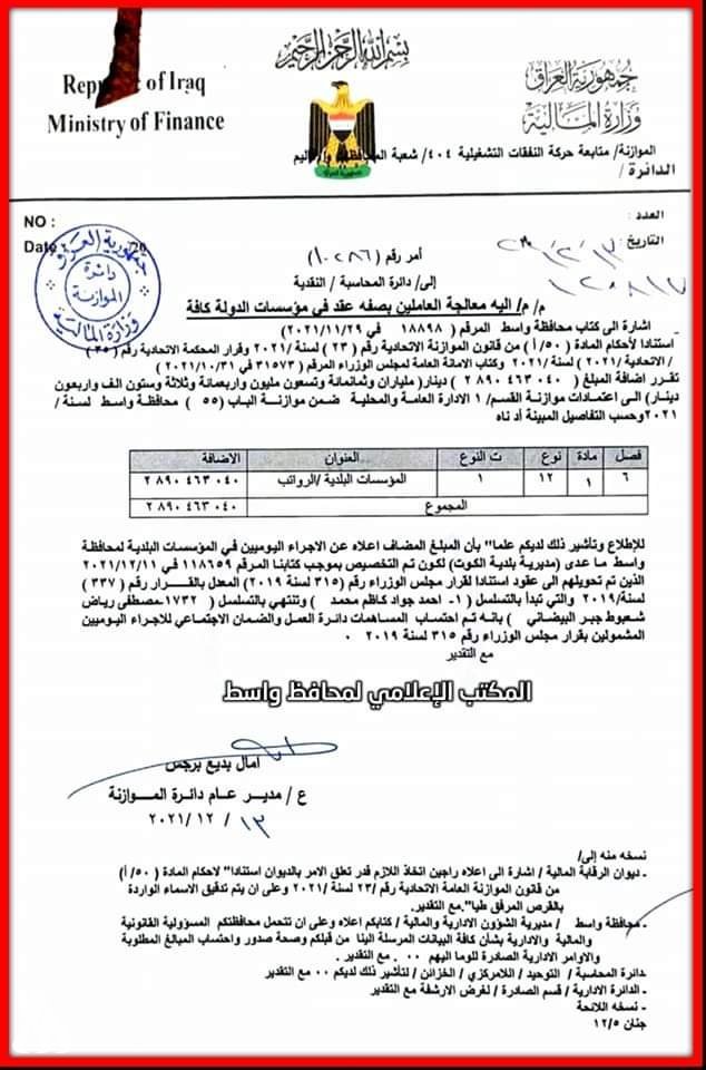 وقال المكتب الإعلامي لمحافظ واسط في بيان تلقته وكالة "تنوع نيوز" إن "الوجبة الأخيرة التي تضمنت أكثر من 1700 موظف عقد في المؤسسات البلدية شملوا بالقرار 315".