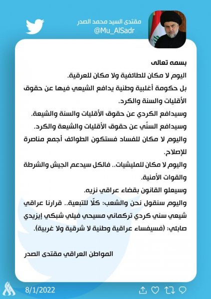 وقال السيد الصدر في تغريدة: إنه "اليوم لا مكان للفساد فستكون الطوائف أجمع مناصرة للإصلاح والكل سيدعم الجيش والشرطة والقوات الامنية".