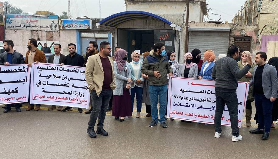تظاهر العشرات من مهندسي الاجهزة الطبية وطب الحياة في دائرة صحة ذي قار، الثلاثاء، احتجاجا على حجب مخصصاتهم الهندسية.