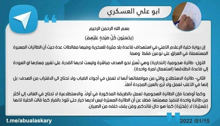فيما ذكر ابو علي العسكري في تغريدته ان “رواية خلية الاعلام الأمني في استهداف قاعدة بلد مثيرة للسخرية وفيها مغالطات عدة”، مشيرا الى ان الطائرات المسيرة المستعملة في العراق على نوعين فقط، الاول نوع الطائرات المسيرة الأول المستعملة في العراق هي طائرة هجومية (انتحارية) وهي تسير نحو الهدف مباشرة وليست لديها القدرة على تغيير مسارها او العودة الى قاعدة انطلاقها (استعمال لمرة واحدة)اما النوع الثاني من الطائرات المسيرة المستخدمة في العراق هي طائرات الاستطلاع والتي من مواصفاتها انها لا تعمل في اجواء الضباب ولا تحتاج الى الاقتراب من الهدف بل انها في الاغلب تعمل ولا ترى في العين المجردة اصلا”.