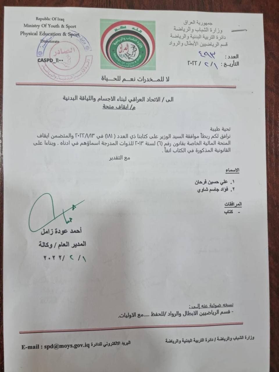 وتابع ان “الاتحاد اوقف اللاعبين لثبوتهم تعاطي المنشطات والتي ضهرت في (الكاينو في الصدر و الحقن الموضعي و انتفاخ البطن ) اثناء المشاركة في بطولة قارة اسيا الاخيرة التي اقيمت في لبنان للعام 2021 حسب ماورد في كتاب الاتحاد الاسيوي الى اتحاد بناء الاجسام والكتاب الوارد الى اتحاد بناء الاجسام من قبل وزارة الشباب والرياضة العراقية”.