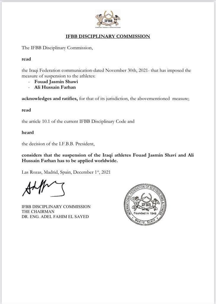 وذكر اتحاد بناء الاجسام في بيان تلقت وكالة "تنوع نيوز" نسخة منه ان “الاتحاد الدولي للعبة بناء الاجسام ابرق الاتحاد العراقي للعبة بمعاقبة اللاعبين العراقيين علي حسين فرحان وفؤاد جاسم شاوي”.